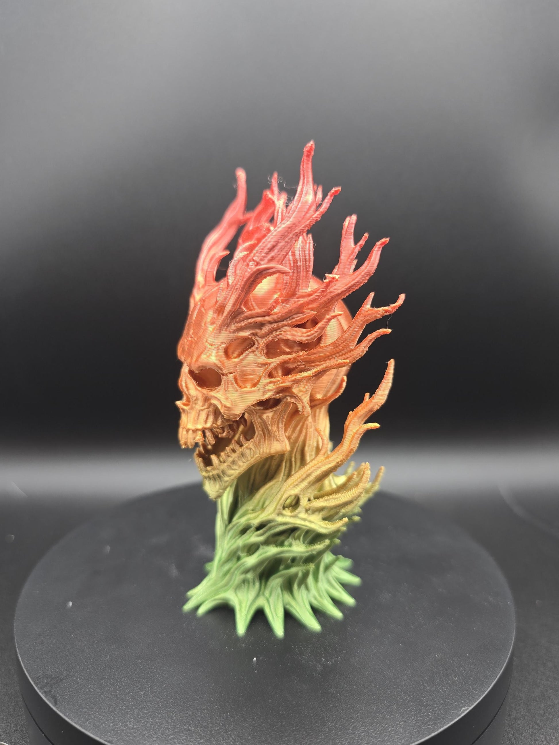 A vibrant skeleton statue with a fiery, flame-like design, blending bold colors with a blazing, otherworldly aura. A striking piece that adds heat and energy to any collection. Can be any colour of your choosing from current stock.